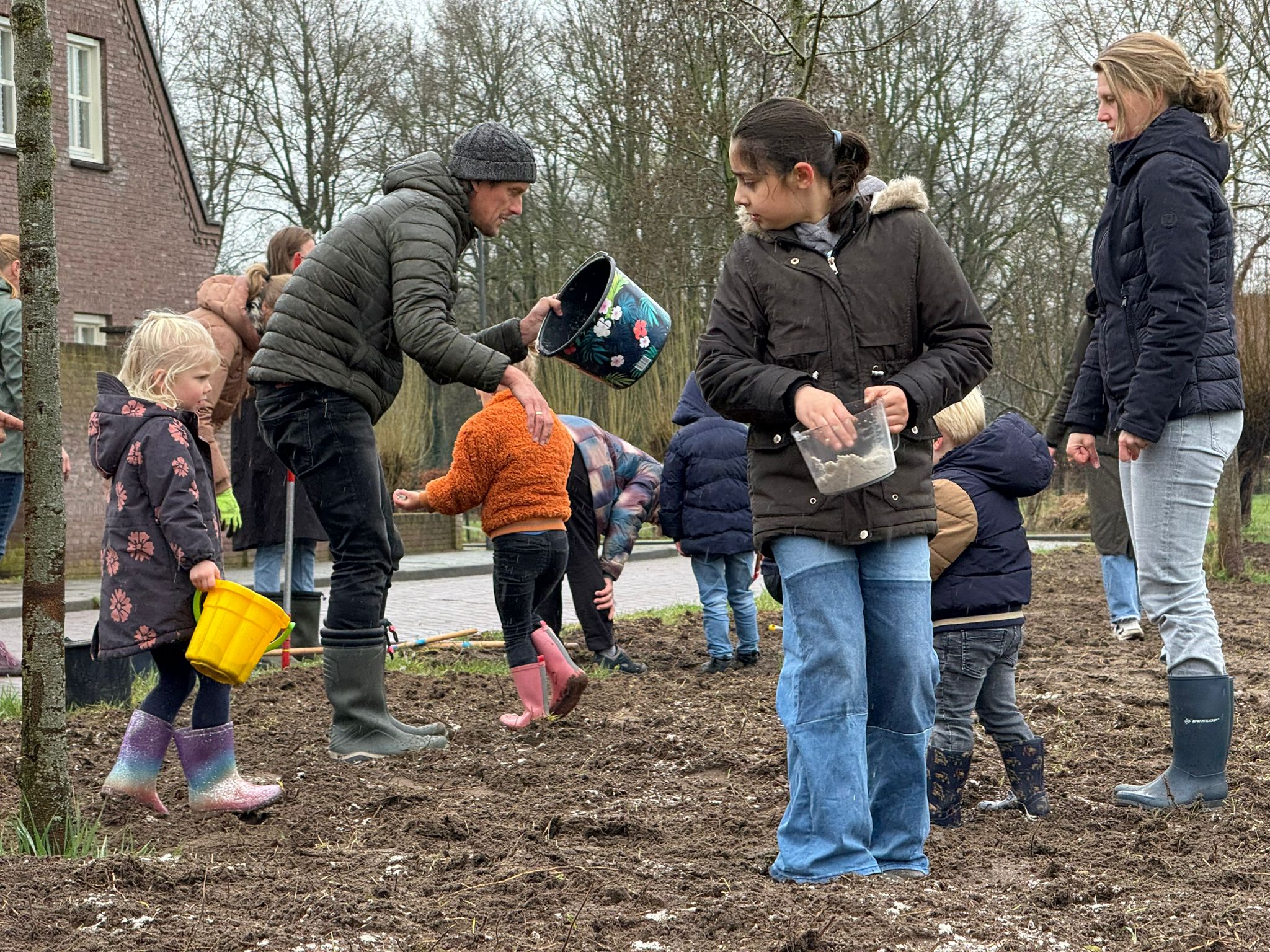 Op zaterdag 14 maart gingen we van start — en wat een mooie ochtend was het. Ondanks de miezerregen trokken 14 kinderen en 13 buurtbewoners samen de wijk in. In twee uur tijd zaaide de buurt bijna 900 m² in met inheemse bloemen en planten: 800 m² aan de Volley en 100 m² bij het Tennispad. Wortels verwijderen, harken, zaaien, nog eens harken — en klaar. Wethouder Sam Goossens was er ook bij om het te vieren en om mee te werken.